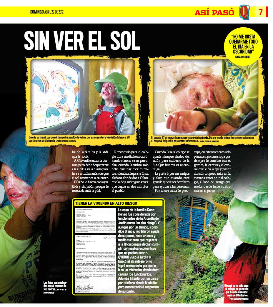 Desde su primer añito de vida hasta el día de hoy, Giovany no puede exponerse al sol, ni al agua, no puede llevar una vida normal, por que la enfermedad que padece Xerodermia Pigmentosa, la cual le produce cáncer en la piel, solo le permite permanecer bajo la oscuridad. Sin embargo su alegría, optimismo, ternura e inocencia le han permitido ser todo un ejemplo de vida para los demás.