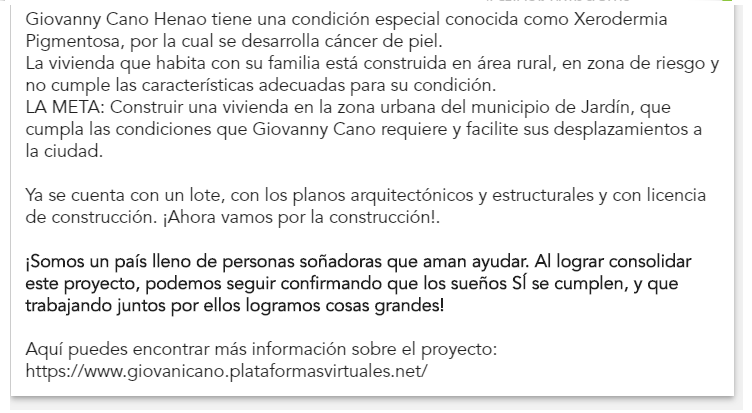Vamos a retomar actividades para alcanzar nuestra meta "Una vivienda acorde a las necesidades especificas del niño Giovany Cano Henao...", esperamos el apoyo de todos ustedes. Tambien queremos informar que las entidades donde se ha pedido ayuda tampoco han logrado cumplirles este sueño. Hacemos esta aclaración ya que conocemos de personas que estan actuando de forma mal intencionada diciendo que a esta familia ya le fue entregada dicha vivienda, de lo cual es mentira. Recuerden no entregar dineros a ninguna persona solo se reciben las ayudas por medio de consignación en la Cuenta de ahorros Bancolombia 2688-6391365 a nombre de Giovany Cano Henao, abierta para tal fin.